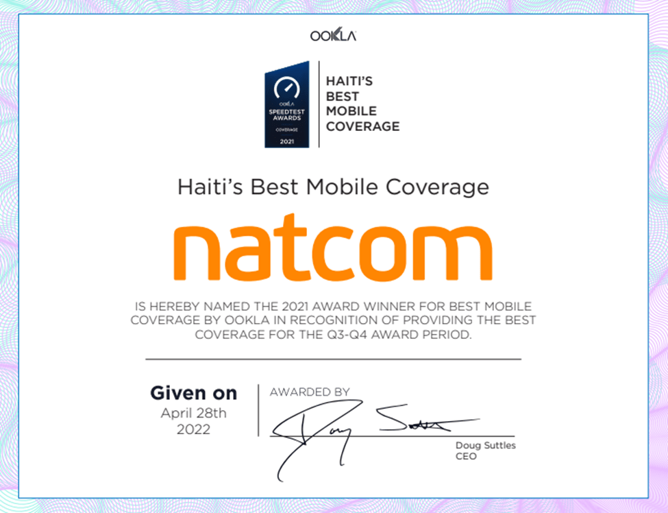 Ce prix permet à la Natcom d’affirmer clairement sa stratégie, par des services de télécommunication universels avec la meilleure qualité, le meilleur prix partout au profit de la clientèle. Dans les villes comme dans les zones rurales, au sommet des montagnes comme dans les vallées, sur la terre ferme comme dans la mer territoriale, le signal de la Natcom est stable. C’est grâce à la passion et l’effort déployé par une équipe enthousiaste cherchant à offrir la meilleure qualité de service à tous les citoyens haïtiens.